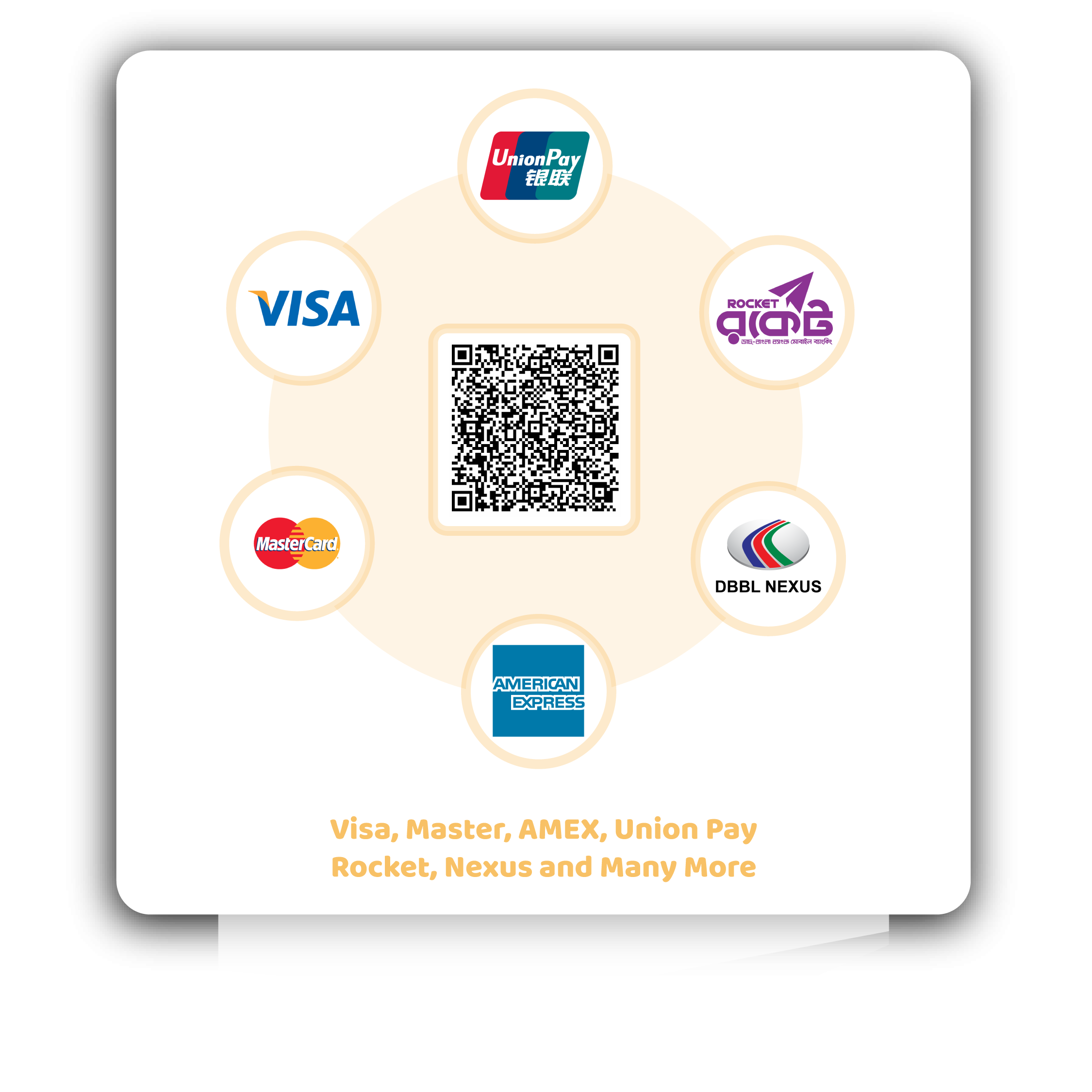 Some of the popular payment methods like Visa, MasterCard, AMEX, UnionPay, QCash, Rocket etc will support aamarQR. You